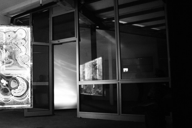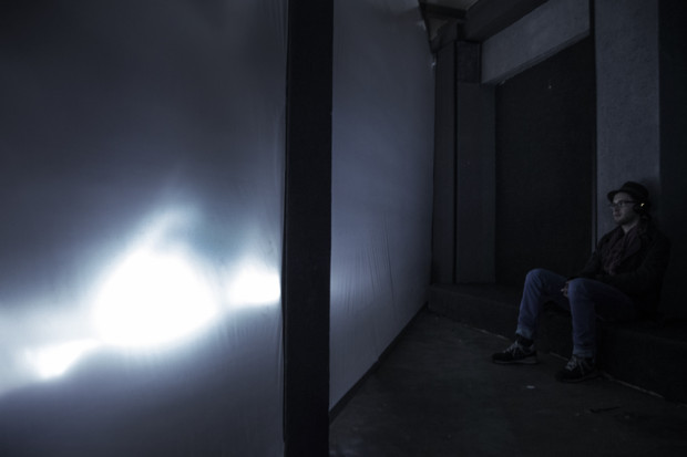 kinetische rauminstallation mit folien dimmbaren neonröhren und ventilatoren 2013 / kinetic installation with transparent foils, dimmable neon tubes and fans.2013